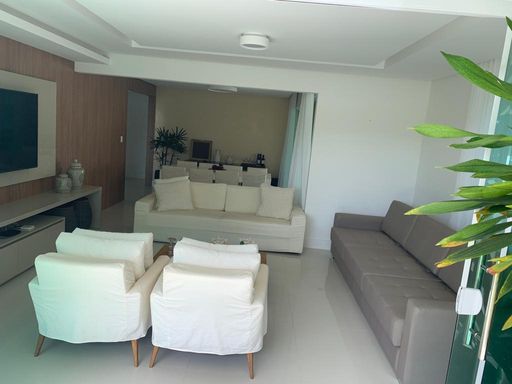 Sala de estar com dois sofás, duas poltronas e mesa de centro, painel na parede e tv de 65 polegadas