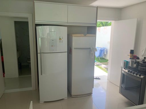 Área de serviço com armários, cervejeira e máquina de lavar