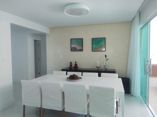 Sala de jantar com mesa e seis cadeiras, aparador e quadros